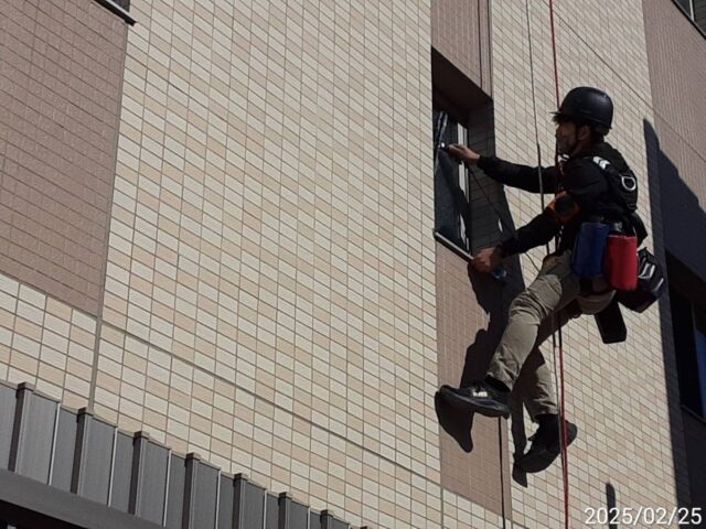 ロープガラス清掃作業中