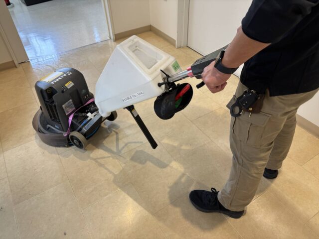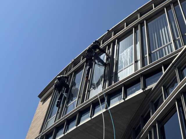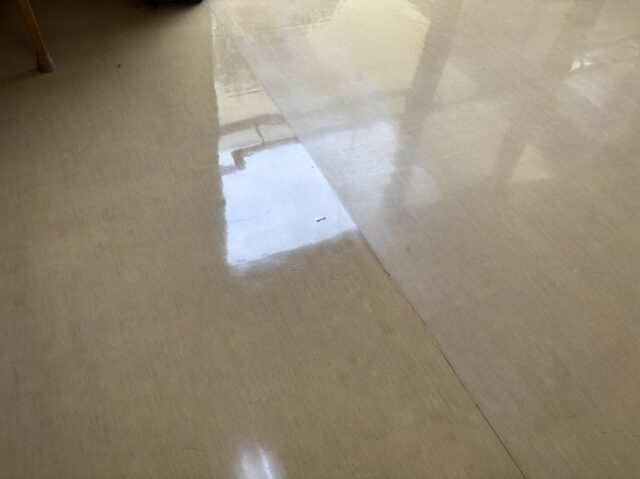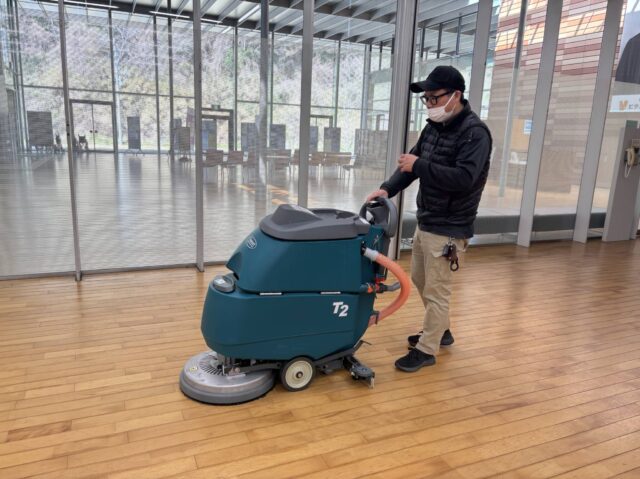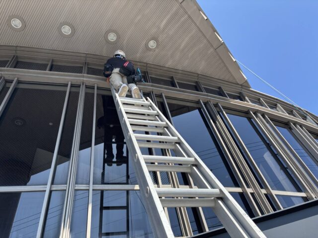 市内施設5 自動洗浄機にて木床の洗浄清掃。 左がワックス塗布後・右がワックス塗布前になります。 ポリシャーにて床面洗浄 二連ハシゴを使用してガラスのクリーニングを行っています。 高所のガラスをロープを使用して清掃