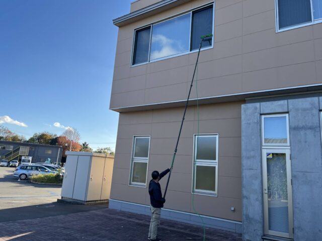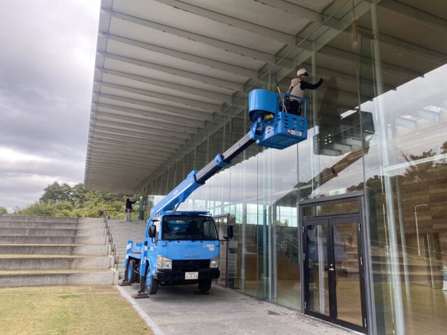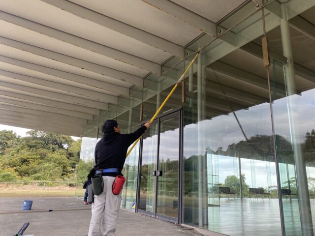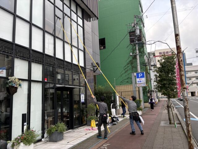 ロープを使用して清掃しています。安全対策をしっかり行い、安全第一で作業しています。