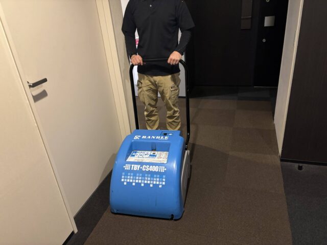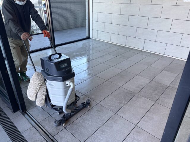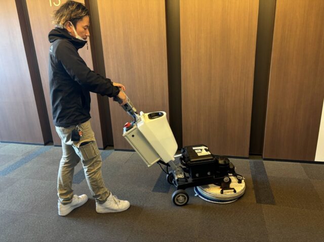 静岡市内某マンション3 バッテリータイプのカーペット清掃機を使用してクリーニング 集塵機にてカーペットの清掃。ブラシが回転してタイルカーペットの目に詰まったホコリや土砂をかきだして集塵します。 タイル面の洗浄。