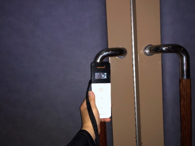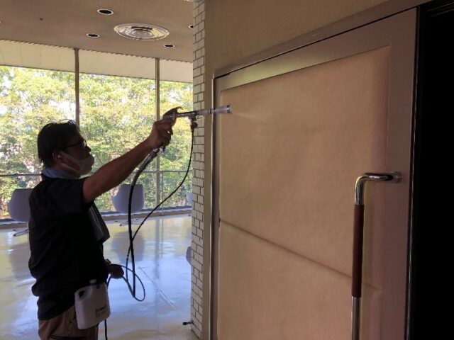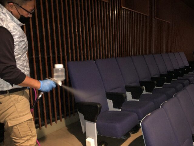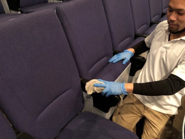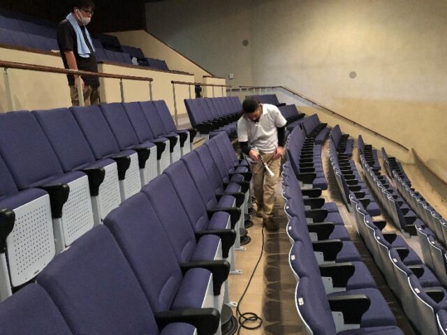 静岡市民文化会館の椅子手摺、椅子、ドアノブ付近等、オールチタンAT254の塗布とアルコール消毒を施工させていただきました。